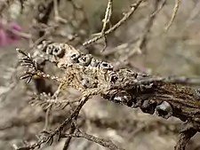 The flowers are a shade of deep pink to purple and are arranged on the sides of older branches and partly buried in them so that only the petals, style and stamens appear above the wood. The petals are 2–3.2 mm (0.08–0.1 in) long and fall off as the flower ages. The stamens are arranged in five bundles around the flowers and each bundle contains 9 to 15 stamens. Flowering occurs between July and January and is followed by fruit which are woody capsules 2–3 mm (0.08–0.1 in) long, roughly spherical in shape, arranged along the branches.[2][3][4]