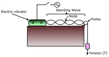 Melde's experiment is a scientific experiment carried out in 1859 by the German physicist Franz Melde on the standing waves produced in a tense cable originally set oscillating by a tuning fork, later improved with connection to an electric vibrator. This experiment, "a lecture-room standby",[1] attempted to demonstrate that mechanical waves undergo interference phenomena. In the experiment, mechanical waves traveled in opposite directions form immobile points, called nodes. These waves were called standing waves by Melde since the position of the nodes and loops (points where the cord vibrated) stayed static.