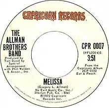"Melissa" is a song by American rock band the Allman Brothers Band, released in August 1972 as the second single from the group's fourth album, Eat a Peach. The song was written by vocalist Gregg Allman in 1967, well before the founding of the group. Two demo versions from those years exist, including a version cut by the 31st of February, a band that featured Butch Trucks, the Allman Brothers' later drummer. Allman sold the publishing rights later that year, but they were reacquired by manager Phil Walden in 1972.