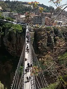 Mellah Slimane Bridge is a 125 m long suspension Footbridge across the Rhumel River in Constantine, Algeria. It was opened in April 1925 and until it was the 3rd highest bridge in the world at 110 m. The bridge was designed by Ferdinand Arnodin and links Larbi Ben M'hidi Larbi Street to Romania Road which means it connects the train station neighbourhood to the centre of the old town, this connection is via a staircase, or the Merdersa lift. It is located halfway between Sidi Rached bridge and Bab El Kantra Bridge. The bridge underwent restoration in 2000 when its cables were replaced by the Algerian company SAPTA.[3]