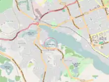 Melville Island is part of the Halifax Regional Municipality, on the southeast coast of Nova Scotia. The peninsula lies on the eastern boundary of Melville Cove in the Northwest Arm, an inlet between the Halifax Peninsula and Mainland Halifax.[1][2] It has a total area of approximately 2,000 square metres (22,000 sq ft).[3] Melville Island is 200 metres (660 ft) west of Deadman's Island, and southeast of Regatta Point.[4] The peninsula lies on a fracture zone trending northwest–southeast, and is located at the border between the Halifax Slate Formation and a granite-based formation. There is evidence of glacial scouring in the area. The surrounding seabed ranges from gravel to muddy gravel, and the shore is rocky.[2]