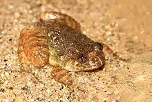 The meowing night frog (Nyctibatrachus poocha) is one of 12 species of frogs in the genus Nyctibatrachus discovered in September 2011.[1] It is found primarily in the Western Ghats, India.[2] The team, composed of researchers from the Bombay Natural History Society, Zoological Survey of India and Vrije Universiteit Brussel, led by herpetologist Sathyabhama Das Biju of the University of Delhi, used morphological traits and molecular markers to identify the 12 new species and three others which were thought to have been extinct.[2][3] The meowing night frog is named for its distinct cat-like call. The species has been seen in NorthEastern Florida in the United States in December 2020 (facts unknown). [4]