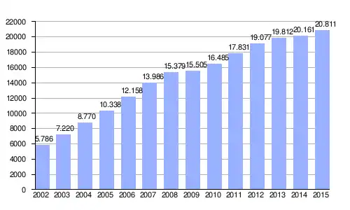 Since its days as a butcher shop in 1977,[6] Mercadona expanded to eight stores in 1981, and 1,148 stores as of October 2013, with more on the way. The chain has had an online shop since 2001, which accounted for one percent of total sales in 2010.[7] Today it holds 13.5% of Spain's total food retail space[8] and brought in more than €508 million in profits for the 2012 fiscal year.[9]