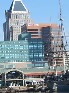 Merchants consolidated with the Mechanics NB of Baltimore in 1912 and consolidated at the Mechanics' location. This property was then surplused and sold to Baltimore insurance company USF&G, which kept it till the 1970s. Baltimore Federal Savings & Loan bought the property in 1977, and in 1982 erected a new 17 story Postmodern style building, spanning the entire block between Water and East Lombard, South and Commerce Streets. The original two story building was preserved as a historic facade. The construction cost was approximately $20 million. The architect was Donald N. Coupard Associates (now DNC Architects),[6] and Whiting-Turner was the general contractor.[7][8][9]