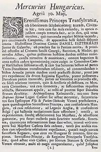 Mercurius Hungaricus (Hungarian: Magyar Merkúr), later Mercurius Veridicus ex Hungaria was the first periodical newspaper in the Kingdom of Hungary,[1] published between 1705 and 1710 (only seven issues). It was a semiofficial news release for the Rákóczi's War of Independence, the articles were written in mostly Latin language.