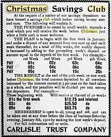 Landis took this idea a step further and published display advertisements in the local paper that his bank was forming a Christmas Savings Club. Starting in the first week of January 1910 club members were allowed to make weekly deposits of any amount until the week before Christmas.[14] They would get paid three percent interest on their total amount saved before being distributed as an incentive to contribute something each week.[15][16] Landis, treasurer of Carlisle Trust Company, had originated the world's first Christmas Savings Club.[17][18] He announced on January 8 that over 600 people had already opened a Club account and that over $20,000 was expected to saved by these members during the year.[19] There were 1269 total members that participated in this first savings club and over $31,000 was distributed among them at the end on December 13, 1910.[20] The concept became popular to banks across the United States and the money used for other things besides Christmas shopping.[21] The bank announced at the end of December that their next membership was open with various plans and people could open a Christmas savings account until January 9, 1911.[22]