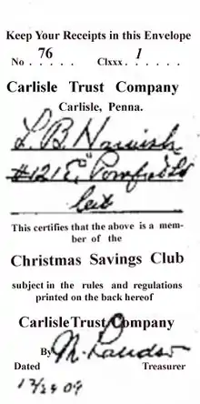 The Carlisle Bank has a museum piece of a 1909 savings booklet showing one of the members received $12.75 after his final payment (average savings of 25 cents per week over 49 weeks + 50 cents for fiftieth week). The savings account belonged to traveling salesman L.B. Harnish, which he opened on December 29, 1909.[30][31] Pictures of the booklet signed by Landis show it was for a Christmas Savings Club account and that it belonged to Harnish.[32]
