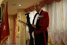 The officers of some ceremonial military corps, such as the Yeomen of the Guard and Gentlemen at Arms, are authorised to wear the evening dress of the Royal Household court uniform as a mess dress.[13][14][15]