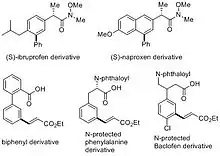 In Gaunt's and Yu's works, some derivatives of drug molecules and biologically active compounds were successfully functionalized in their meta-position. For instance, meta-arylated derivatives of anti-inflammatory drugs (S)-ibruprofen and (S)-naproxen were synthesized with copper catalyzed C–H arylation.[18] Meta-olefinated biologically important biphenyl, amino acid and Baclofen derivatives have been accessed by remote C–H activation assisted by the "end-on" template.[6] These demonstrate the potential applications of meta-selective C–H functionalization in medicinal chemistry.