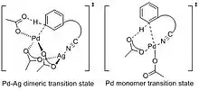 The mechanistic study of the palladium-catalyzed meta-selective C–H bond activation with a nitrile-containing template was done by Yu, Wu, Houk and their co-workers.[25] The DFT calculations suggest that the regioselectivity is achieved in the C–H activation step, which is the rate-determining step. It proceeds via a concerted metalation-deprotonation (CMD) pathway, which means that palladation and deprotonation of the C–H bond happen at the same time. Surprisingly, calculations reveal that the Pd–Ag heterodimeric transition state leads to meta-selectivity while the Pd monomeric transition state leads to ortho-selectivity.