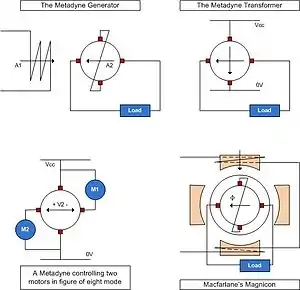 A metadyne is a direct current electrical machine with two pairs of brushes. It can be used as an amplifier or rotatory transformer. It is similar to a third brush dynamo but has additional regulator or "variator" windings. It is also similar to an amplidyne except that the latter has a compensating winding which fully counteracts the effect of the flux produced by the load current. The technical description is "a cross-field direct current machine designed to utilize armature reaction". A metadyne can convert a constant-voltage input into a constant-current, variable-voltage output.