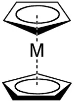 Metallocenes are a subset of a broader class of compounds called sandwich compounds.[1] In the structure shown at right, the two pentagons are the cyclopentadienyl anions with circles inside them indicating they are aromatically stabilized. Here they are shown in a staggered conformation.