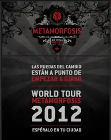 The Metamorfosis World Tour was a worldwide concert tour by Guatemalan singer–songwriter Ricardo Arjona in support of his thirteenth studio album, Independiente. Beginning in January 2012, it was Arjona's first tour since leaving Warner Music to become an independent artist. The tour was announced in December 2011[1] with dates at American, Argentinian and Chilean venues, and received a positive critical response. The show was designed for a revolving stage, with Arjona performing while the scenery changed with the songs being performed. Four changes of scenery were developed: a two-floor apartment, a bar, a circus and a theatre. The number of songs played at each show varied from 19 to 23.