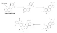 A possible mechanism for this reaction is depicted in figure (2). 3-MC is metabolized, via epoxidation, hydrolysis and another epoxidation, to a very reactive epoxide. Epoxidations are realized by the enzyme cytochrome P450. The second epoxide is not hydrolysed immediately because it is localized next to a bay region, which shields the epoxide. This way, the metabolite is able to travel and bind to DNA in figure (2). The mechanism is derived from the binding mechanism of benzo[a]pyrene to DNA. This is likely because it is plausible that two polycyclic aromatic hydrocarbons are metabolized via the same pathway. Deoxyguanosine is used in the figure, since that base appears to be bound to Benzo[a]pyrene far more often than the other bases.[8][9]
