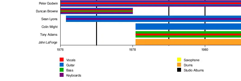 - Peter Godwin – vocals, tenor saxophone, keyboards (1976—1980)