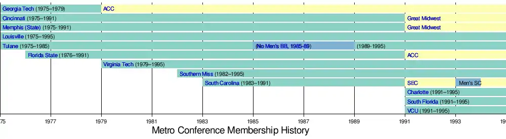 The Metro Conference was founded in 1975 with institutions that were located in urban metropolitan areas. The charter members were the University of Cincinnati, Georgia Institute of Technology, the University of Louisville, Memphis State University (now the University of Memphis), Saint Louis University and Tulane University. Florida State University joined in 1976, while the University of South Carolina turned down an invitation in hopes of rejoining the Atlantic Coast Conference.