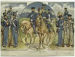 The war was fought by regiments of regulars and various regiments, battalions, and companies of volunteers from the different states of the Union as well as Americans and some Mexicans in California and New Mexico. On the West Coast, the U.S. Navy fielded a battalion of sailors, in an attempt to recapture Los Angeles.[53] Although the U.S. Army and Navy were not large at the outbreak of the war, the officers were generally well trained and the numbers of enlisted men fairly large compared to Mexico's. At the beginning of the war, the U.S. Army had eight regiments of infantry (three battalions each), four artillery regiments and three mounted regiments (two dragoons, one of mounted rifles). These regiments were supplemented by 10 new regiments (nine of infantry and one of cavalry) raised for one year of service by the act of Congress from February 11, 1847.[54] A large portion of this fighting force consisted of recent immigrants. According to Tyler V. Johnson, foreign-born men amounted to 47 percent of General Taylor's total forces. In addition to a large contingent of Irish- and German-born soldiers, nearly all European states and principalities were represented. It is estimated that the U.S. Army further included 1,500 men from British North America, including French Canadians.[55][56]
