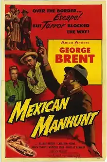 Mexican Manhunt is a 1953 American crime film directed by Rex Bailey and starring George Brent, Hillary Brooke and Morris Ankrum.[1] The screenplay concerns a Los Angeles-based author who travels to Mexico to search for a celebrated journalist who disappeared there many years before.