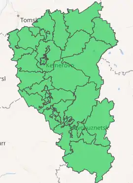 Within the framework of administrative divisions, Mezhdurechensky District is one of the nineteen in the oblast.[1] The city of Mezhdurechensk serves as its administrative center, despite being incorporated separately as a town under oblast jurisdiction—an administrative unit with the status equal to that of the districts.[1]