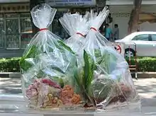 Miang kham (Thai: เมี่ยงคำ, RTGS: miang kham, pronounced [mîa̯ŋ kʰām]) is a traditional Southeast Asian snack from Thailand and Laos (Lao: ໝ້ຽງ Lao pronunciation: [mȉaːŋ]). It was introduced to the Siamese court of King Rama V by Princess Dara Rasmi.[1] In Malaysia it is called Sirih Kaduk. The name miang kham translates to 'one bite wrap', from miang ('food wrapped in leaves') and kham ('a bite').