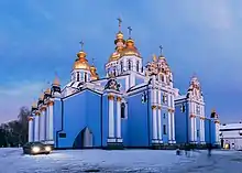 St. Michael's Golden-Domed Monastery (Ukrainian: Михайлівський золотоверхий монастир, Mykhaylivs’kyi zolotoverkhyi monastyr) is a monastery in Kyiv, the capital of Ukraine. The monastery is located on the edge of the bank of the Dnieper River, northeast of the Saint Sophia Cathedral. The site is located in the historic administrative Uppertown and overlooks the city's historical commercial and merchant quarter, the Podil neighbourhood.