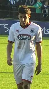 Coulson was released by Barnsley at the end of the season, leaving him free to join Grimsby permanently, signing a two-year contract on 31 May 2010.[54] In the third match of 2010–11, at home to Hayes & Yeading United on 21 August 2010, he took a kick to his ankle, which was expected to keep him out of the team for a month.[55][56][57] He returned on 18 September 2010 after starting in a 2–1 defeat at home to Fleetwood Town, but was substituted at half-time.[58] Coulson made a goalscoring second comeback from his ankle injury in Grimsby's 2–2 home draw with Eastbourne Borough on 30 October 2010.[59] For the first time as a Grimsby player he scored twice in one match in a 2–1 victory at home to AFC Wimbledon on 5 March 2011, with a first-half shot into the bottom left of the goal and a second-half shot into the top-left corner from inside the penalty area.[55][60] Coulson's first season as a permanent Grimsby player concluded having scored nine goals in 33 appearances.[55]