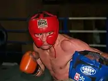 Armstrong boxed as an amateur before turning professional in June 1995. He chose the professional surname "Gomez" when the British Boxing Board of Control (BBBoC) required him to select another name at the time of his registration as a professional; there was another boxer in the same weight division using the name "Michael Armstrong". He chose his ring name in honour of Puerto Rican boxer Wilfredo Gómez, whose videotaped fights Armstrong had studied intently as a youth.[9][10] The name, combined with Gomez's "brawling style",[13] earned him the nickname of "the Irish Mexican". He developed a ring persona based on this nickname, which has remained popular with fans throughout his career. His ring entrance music is that of a Mexican Mariachi band, a reference to his Hispanic-sounding chosen name, and many of his supporters wear sombreros to his fights and wave Irish flags. Gomez also wears long Mexican-style boxing shorts in the colours of the flag of Ireland and often has the shape of a shamrock shaved into the hair on the back of his head.[6][10][14]