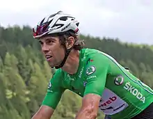 Matthews was expected to contend for the points classification at the 2017 Tour de France, and his chances were boosted on Stage 4 after an incident during the final sprint which saw Mark Cavendish forced out of the race through injury and Peter Sagan, winner of the classification in the previous 5 Tours, disqualified.[17][18] Matthews won Stage 14, a reduced peloton uphill sprint finish at Rodez.[19] On Stage 16, the high pace set by Matthews's Team Sunweb dropped the green jersey wearer Kittel; Matthews, who was second to Kittel in points classification, won the stage.[20] On Stage 17, Kittel crashed and withdrew from the Tour, putting Matthews in the green jersey.[21] Matthews retained the jersey to Paris.