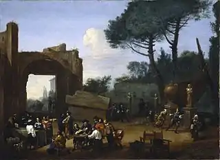 In his early genre works Cerquozzi showed his mastery of the style of Pieter van Laer and Jan Miel in their compact scale, anti-heroic subject-matter and dramatic chiaroscuro effects.[2] In these works Cerquozzi explored the humble life of the Roman people, among its ruins, in its taverns and their quarrels. He often set the scenes in Rome and the surrounding Campagna.[3] Cerquozzi was not a slavish follower of these Flemish and Dutch models and differed from them in his emphasis on contemporary narrative and anecdotal elements. He also introduced figures of higher social standing, a tendency also present in Jan Miel's work during the 1640s and 1650s.[2][12] Cerquozzi's Party in a garden with Roman artists (Kassel, Gemäldegalerie Alte Meister) displays typical bambocciata characteristics in its naturalism and small format. However, rather than the usual low-life figures it depicts groups of finely dressed men and women. These include the artist himself, his doctor Vincenzo Neri and other friends engaged in conversation and games.[2]