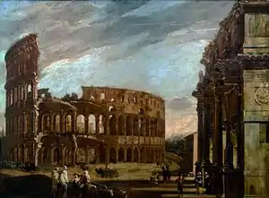Cerquozzi and Codazzi became frequent collaborators. As Codazzi's compositions typically depicted Antique ruins and monuments, the collaboration likely made Cerquozzi move away from the representation of anecdotes of rural life to more elevated and exotic subjects. In 1657 the two artists collaborated on various canvases for Cardinal Flavio Chigi, one of the most important art patrons of his time. Some of the canvases made for Cardinal Chigi treated original subject matter. For instance, a composition entitled Women's bath represents a fantastic Renaissance interior in which numerous naked women are shown in sunken pools, possibly a surprising subject for a commission by a Cardinal.[6]