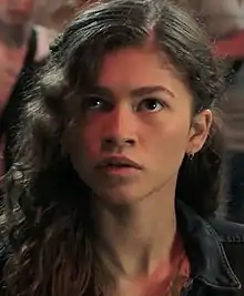 MJ is portrayed by actress Zendaya in the Marvel Cinematic Universe as a classmate of Peter Parker at Midtown School of Science and Technology and a teammate on the academic decathlon team. She is depicted as politically active with critical views, and a loner who claims to echew friendship.[11][12] Zendaya described the character as "very dry, awkward, intellectual".[13] This sometimes manifests itself in the form of deadpan sarcasm,[14][15][16] as when she calls Peter and Ned "losers" for ogling his crush, Liz Allan from afar.[12] Among her unusual hobbies is attending detention simply to "sketch people in crisis."[11][12][17]