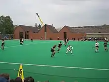 Michigan has played its home games at Phyllis Ocker Field Hockey Field since its construction in 1995. The field is named after Phyllis Ocker, a former University of Michigan teacher, field hockey coach, and athletics administrator. In 2003, Ocker Field's AstroTurf playing surface was upgraded at the cost of $500,000.[7] Between the end of the 2013 season and the start of the 2014 season, Ocker Field underwent substantial renovations that included the installation of a blue AstroTurf 12 playing surface and a permanent 1,500-seat grandstand, which tripled the stadium's capacity.[7] In 2017 Ocker Field received a new playing surface with the installation of a Poligras Platinum CoolPlus field. Between the 2003 and 2014 renovations, the stadium had a seating capacity of 500.[8] Before the construction of Ocker Field, the Michigan field hockey team had played at four other venues on campus: Michigan Stadium (1973–75), Ferry Field (1976–86), the Tartan Turf (1987–90), and Oosterbaan Fieldhouse (1991–94).[8]