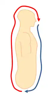 As well as the lower dantian or cauldron there are other important points along the circuit of energy flow which include the 'three gates' which are areas where it is considered that energy may stagnate, these are the wei-lu or Tailbone gate, the Dorsal gate on the back roughly level with the heart, and the Jade pillow on the back of the head.[9] Other important areas include the Ming Men or gate of fire on the back about level with the kidneys and the Baihui or Niwan which is directly on top of the head.[10]