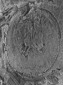 The fossils are approximately discoid, and covered with a net-like pattern. Fine hair-like projections extend beyond the edge of this almost-flat, firm (but non-mineralized) "shell", which bears no trace of muscle scars.[1]