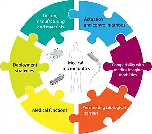 The design of an untethered microscopic mobile machine or microrobot to function in vivo with medical interventional capabilities should assume an integrated approach where design 3D body shape, material composition, manufacturing technique, deployment strategy, actuation and control methods, imaging modality, permeation of biological barriers, and the execution of the prescribed medical tasks need to be considered altogether, as illustrated in the diagram on the right above. Each of these essential aspects contains a special design consideration, which must be reflected at the physical design of the microrobot.[181]