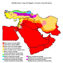Climate change is expected to put significant strain on already scarce water and agricultural resources within the MENA region, threatening the national security and political stability of all included countries.[74] This has prompted some MENA countries to engage with the issue of climate change on an international level through environmental accords such as the Paris Agreement. Law and policy are also being established on a national level amongst MENA countries,[75] with a focus on the development of renewable energies.[76]Gallery