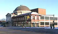 Wayne State University's Bonstelle Theatre is located at 3424 Woodward at the north end of the district; it was origally the Temple Beth El. At the turn of the 20th century, Rabbi Leo M. Franklin of Detroit's Temple Beth El led the push for the construction of a new temple building.[7] He hired architect Albert Kahn, a member of the congregation, to design the building.[7] Groundbreaking began on November 25, 1901, with the ceremonial cornerstone laid on April 23, 1902.[7] The first services were held in the chapel on January 24, 1903, and the formal dedication was held on September 18–19 of the same year.[7]