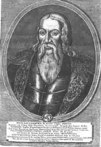 Mikalojus Radvila or Mikolaj I[2] nicknamed the Old (Lithuanian: Mikalojus Radvilaitis, Mikalojus II Radvila Senasis, Polish: Mikołaj Radziwiłłowicz Stary, Latin: Nicolaus II Radziwil Priscus) (c. 1450 – 16 July 1509) was a Lithuanian noble. He was known after a patronym Radvilaitis, made of his father's name Radvila, which in turn became a family name of his heirs, Radvilos, which later polonised as Radziwiłł.