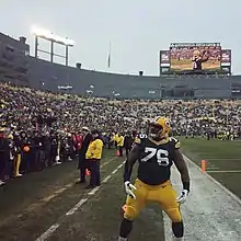 Daniels was selected in the fourth round (132nd overall) of the 2012 draft by the Green Bay Packers who first noticed him a year before when looking at other defensive linemen from Iowa.[10][11][12] Defensive coordinator Dom Capers commented that "The thing that jumps out at me is the way he plays the game."[10] He scored his first touchdown on December 9, 2012 against the Lions after recovering a fumble by Matthew Stafford. During his rookie season in 2012, Daniels played 14 games with 12 tackles, 2 sacks, 1 pass defended, and 2 fumble recoveries. In 2013, Daniels appeared in 16 games making 28 tackles and 6.5 sacks. In 2014, Daniels started all 16 games with 47 tackles and 5.5 sacks. On December 14, 2015, Daniels signed a 4-year contract extension worth $42 million.[13] On December 27, 2015, despite the Packers' bad performance on the offensive line and being blown out 38–8 by the Arizona Cardinals, Daniels snagged his first interception from Carson Palmer. Daniels finished the 2015 season with 49 tackles, 4 sacks, 1 interception, 2 passes defended, and 1 forced fumble.