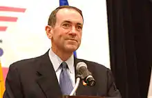In December 2007, Huckabee began challenging other candidates for first place in national polls among Republicans. On January 3, 2008, Huckabee won the Iowa Republican Caucuses with 34% of the electorate.[7] On Super Tuesday, Huckabee won an additional six states, including most of the Deep South.[8] After losing the Texas primary in March, however, Huckabee officially ended his campaign and conceded the race to U.S. senator John McCain.[9]
