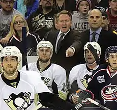 Johnston was hired as the head coach of the Pittsburgh Penguins on June 25, 2014. During the 2014–15 season, the Penguins stormed out of the gate to a 22–6–4 record, but as injuries started to mount, Pittsburgh began to struggle and finished the season eighth in the Eastern Conference.[10] The Penguins would be eliminated in the first-round of the playoffs by the New York Rangers.
