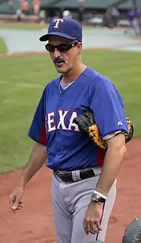 After his first season as pitching coach with Texas, the club's ERA dropped nearly one full run (0.99).[17] In 2011, when the Rangers went to the World Series for the second consecutive season, they lacked star pitching. The rotation was composed primarily of C. J. Wilson, with a 6.02 ERA when Maddux arrived; Colby Lewis, who had just pitched in Nippon Professional Baseball in Japan; Scott Feldman, and Tommy Hunter.[14] During Maddux' time with the Rangers, club won 612 games, third-most in the AL, and achieved a collective ERA of 4.04, including four consecutive seasons below 4.00. From 2010–13, their ERA was 3.83, third-lowest in the AL.[16] They trimmed the average number of runs allowed in his six years to 707.[14] Five pitchers became All-Stars in Maddux' tenure: Yu Darvish, Neftalí Feliz, Matt Harrison, Alexi Ogando, and Wilson. The Rangers reached the postseason four times and won two AL pennants.[16]