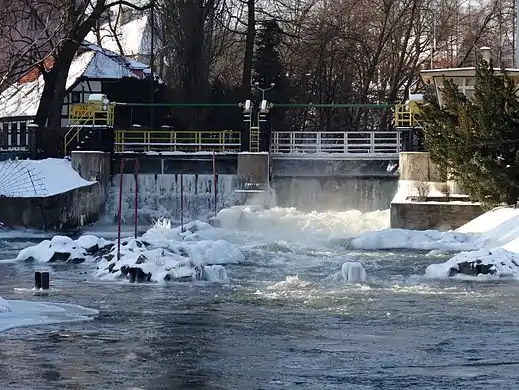 In the Middle Ages, first mills appeared on the eastern part of the island. At the end of the 14th century, for economical and military defense purposes, water network in the western Old Town was improved, so as to take advantage of Brda river first weir, Jaz Farny (literally "Parish weir"), has been created, along with a lock and a navigable channel which is today the actual riverbed of Brda river.[7] Around 1400, opposite Bydgoszcz Cathedral has been built the mill of the church (młyn kościelny). At the time, royal mills belonging to Bydgoszcz starosta, were standing at the junction of the "Międzywodzie kanal" and the leat channel. In 1541, several large five-wheel driven mills and a sawmill were working on the island. In addition to corn and malt mills, there were also fulling mills for wool cleansing and leather tanning.