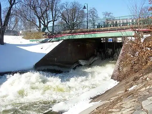 The "Eastern island" and western part of "Międzywodzie kanal" have been buried during the 1960s and recreated in the form of a cascade in 2007.[6]