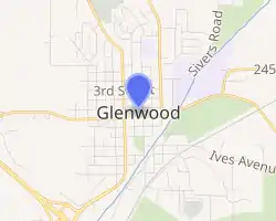 Glenwood was named the county seat when Mills County was organized in 1851, but it was called Coonville at the time.[1] The first courthouse was a two-story brick structure with a tin roof that was completed in 1857. It measured 50 by 45 feet (15 by 14 m).[2] County offices were located on the main floor and the courtroom with its 20 feet (6.1 m) ceiling was located on the second floor. The courtroom was used for various public events in addition to court sessions. In 1910 an addition was built by W.S. Doan.