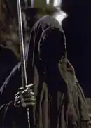 In the Rankin-Bass adaptation of The Return of the King, the Nazgûl are robed skeletons with white hair. They ride winged horses, although the Witch-king rides a creature more in line with the book when he confronts Éowyn.[18] The 1981 BBC Radio serial of The Lord of the Rings has the Nazgûl chant the Ring-inscription in the Black Speech of Mordor.[19] The 1991 Russian television play Khraniteli features a group of Nazgûl galloping through a snowy pine forest; they wear black cloaks, with glimpses of red equipment.[20]
