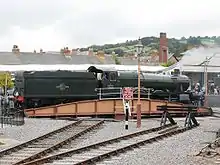 The original turntable was removed from the station in 1967, after steam trains and GWR Autocoach services were completely replaced by Diesel Multiple Units. The WSR acquired both the 55 feet (17 m) turntable and water tower from Pwllheli railway station in anticipation of reinstalling a facility at the station, but later sold the water tower to the Welshpool and Llanfair Railway in 1999. In 2007, the company agreed plans for a £6M development with Somerset Council, to provide a new site for the turntable, together with a viewing area, extended car parking and some ancillary buildings.[3] The turntable was extended using genuine-GWR engineering pattern drawings to 65 feet (20 m),[4] and then installed at its new location, brought into use in May 2008.[5]