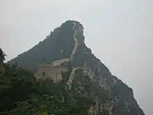 In 1550, having once more been refused a request for trade, Altan Khan invaded the Xuan–Da region. However, despite several attempts, he could not take Xuanfu due to Weng Wanda's double fortified line while the garrison at Datong bribed him to not attack there.[23] Instead of continuing to operate in the area, he circled around Weng Wanda's wall to the relatively lightly defended Gubeikou, northeast of Beijing. From there Altan Khan passed through the defences and raided the suburbs of Beijing. The Ming court put up minimal resistance and watched the suburbs burn as they waited for reinforcements to drive the invaders out. According to one contemporary source, the raid took more than 60,000 lives and an additional 40,000 people became prisoners. As a response to this raid, the focus of the Ming's northern defences shifted from the Xuan–Da region to the Jizhou and Changping Defence Commands (昌平鎮) where the breach took place.[13] Later in the same year, the dry-stone walls of the Ji–Chang area were replaced by stone and mortar. These allowed the Chinese to build on steeper, more easily defended slopes and facilitated construction of features such as ramparts, crenelations, and peepholes.[29] The effectiveness of the new walls was demonstrated in the failed Mongol raid of 1554, where raiders expecting a repeat of the events of 1550 were surprised by the higher wall and stiff Chinese resistance.[30]