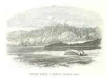 The local Innu people call the river Ekuantshiht Hipu or Memekuauhekau Hipu.[1] The name Mingan is thought to be of Breton origin, meaning "white stone".[4] The bay at its mouth was called the Grande Rade de Meigan in 1735 by the hydrographer Richard Testu de La Richardière. The navigator James Cook called it the Baye de Mingan in 1784.[5] The river is identified on the 1775 map by John Mitchell.[1]