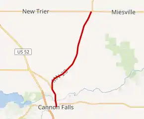 Highway 20 serves as a north–south route between Cannon Falls and State Highway 50 near Miesville. Its northern terminus is 400 feet west of Highway 50's junction with U.S. 61.